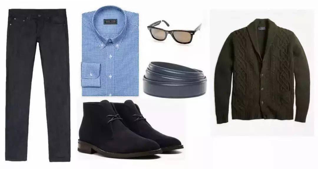 建议搭配:衬衫、针织开衫、黑色或棕色皮带、牛仔裤、绒面皮靴。 休闲衬衫搭配针织开衫比较随性,牛仔配簏皮靴非常的美式风格,性感比较内敛又有点点个性的男生选择这套风格会很沉稳哦。